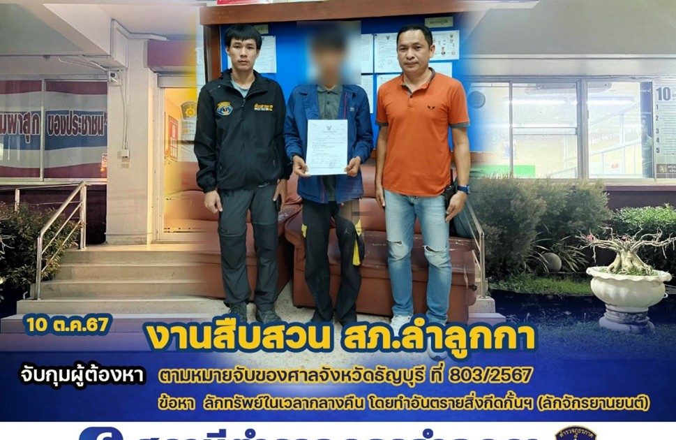 วันที่ 10 ต.ค.2567 จับกุม นายแฟรงค์ หมายจับ ข้อหา ร่วมกันลักทรัพย์ฯ สถานที่จับกุม ริมถนนหน้า WDC SHOWROOM นิมิตใหม่ หมู่ 10 ต.บึงคำพร้อย อ.ลำลูกกา จ.ปทุมธานี