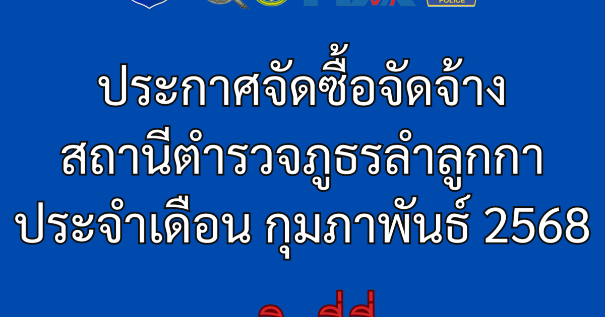 ประกาศจัดซื้อจัดจ้าง เดือน กุมภาพันธ์ 2568 28 กุมภาพันธ์ 2568 โดย admin / ข่าวจัดซื้อจัดจ้าง,ข่าวประชาสัมพันธ์,งานการเงินและพัสดุ ยอดการเช้าชม : 65 ประกาศสถานีตำรวจภูธรลำลูกกา เรื่อง ประกาศผู้ชนะการเสนอราคาจัดซื้อน้ำมันเชื้อเพลิง เพื่อใช้ในภารกิจป้องกันปราบปรามอาชญากรรม โดยวิธีเฉพาะเจาะจง เดือน กุมภาพันธ์ 2568 ประกาศสถานีตำรวจภูธรลำลูกกา เรื่อง ประกาศผู้ชนะการเสนอราคาซื้อวัสดุสำนักงาน โดยวิธีเฉพาะเจาะจง