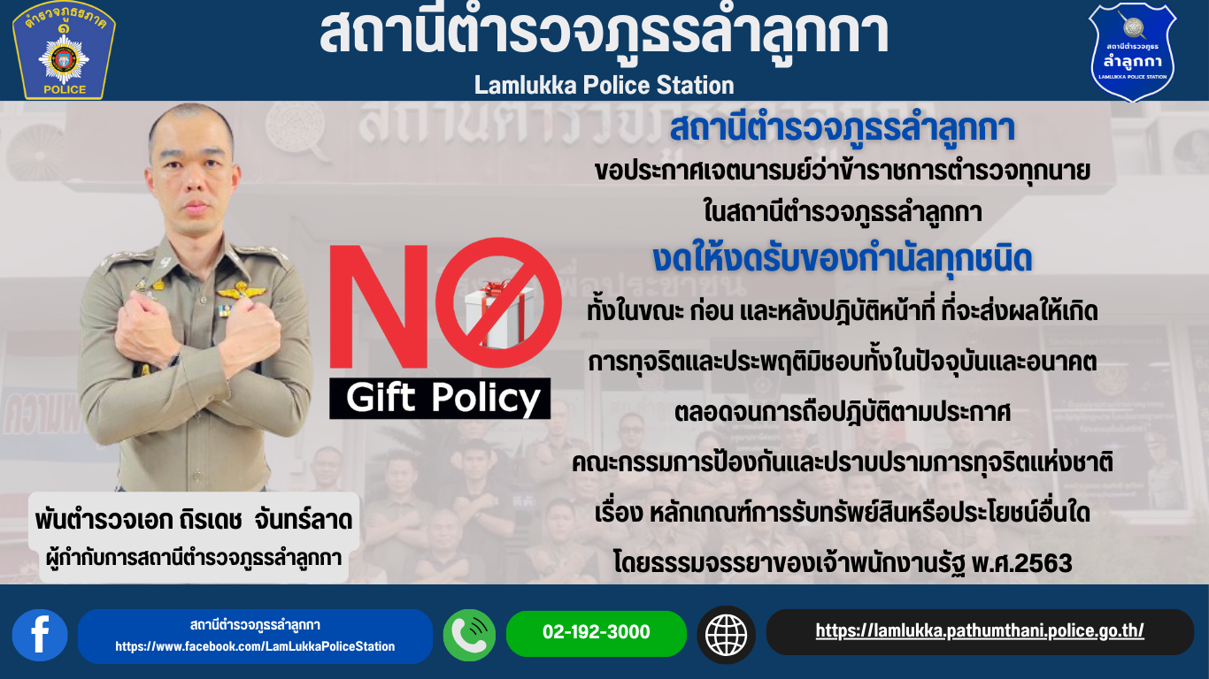 พ.ต.อ.ถิรเดช จันทร์ลาด ผกก.สภ.ลำลูกกา ประกาศเจตนารมณ์ของหน่วยงาน ประกาศเจตนารมณ์ ในการป้องกันการแล