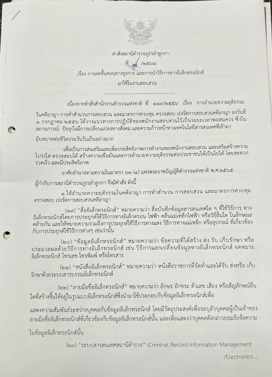วันที่ 12 มกราคม 2568 ประมาณ 08.00 น. พ.ต.ท.ไตรเภท รัฐมนตรี สวป.สภ.ลำลูกกา ได้มอบหมายให้ ร.ต.ต.รัฐ